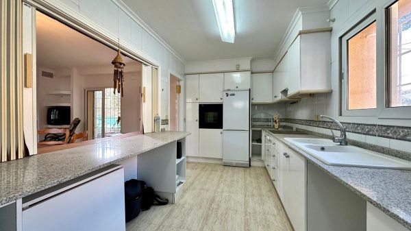 Detached villa with a beautiful garden next to the sea in Las Rotas, Denia, only 100 metres from the cozy beaches and with a perfect southeast orientation.~This property has been kept in excellent condition thanks to the fact that it has had only one owner. Its functional and cosy distribution is organised on two floors and a basement.~On the main floor, upon entering, we are welcomed by a spacious and bright hall that leads to an elegant living-dining room with fireplace, ideal for relaxing, with direct access to a covered terrace from which you can enjoy the views to the garden. The independent large kitchen has a window to living area and it has a separate laundry room. Furthermore, this floor houses two large bedrooms and a complete bathroom.~The first floor is a private retreat where is the master bedroom with an en suite bathroom and access to two terraces offering sea and mountain views.~The basement has a large storage room and a garage with capacity for 3-4 vehicles, with direct access to the property, offering comfort and security.~Additional features of this property include air conditioning and fitted wardrobes in all bedrooms.~Its privileged location, just 100 metres from the beaches and surrounded by a wide range of restaurants and bars on the seafront, makes this villa the perfect choice for those looking for peace and quiet with all the comforts.~~~