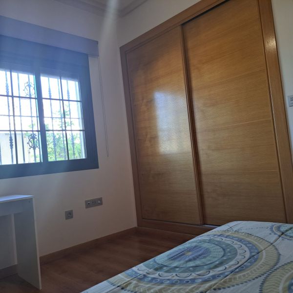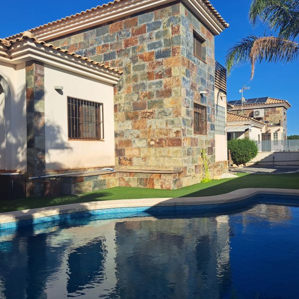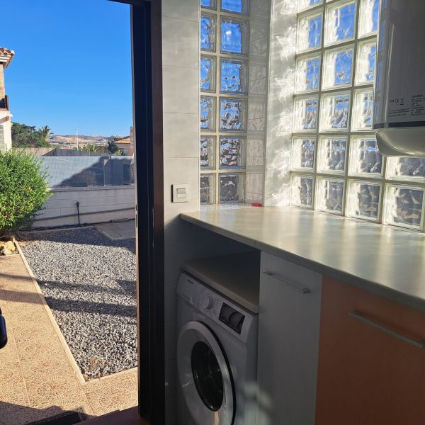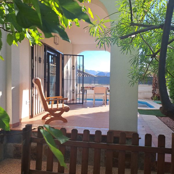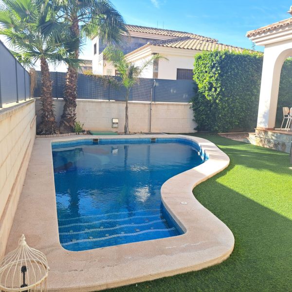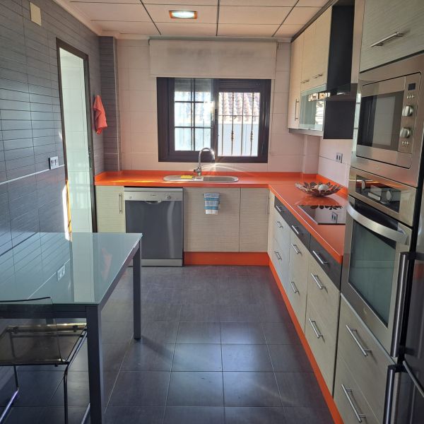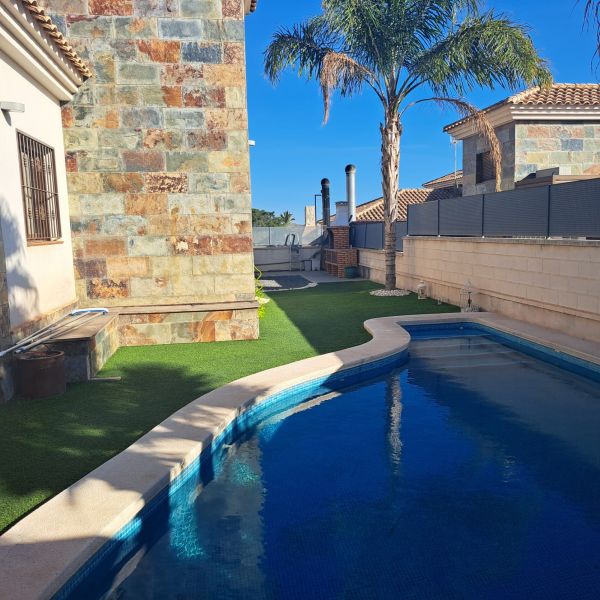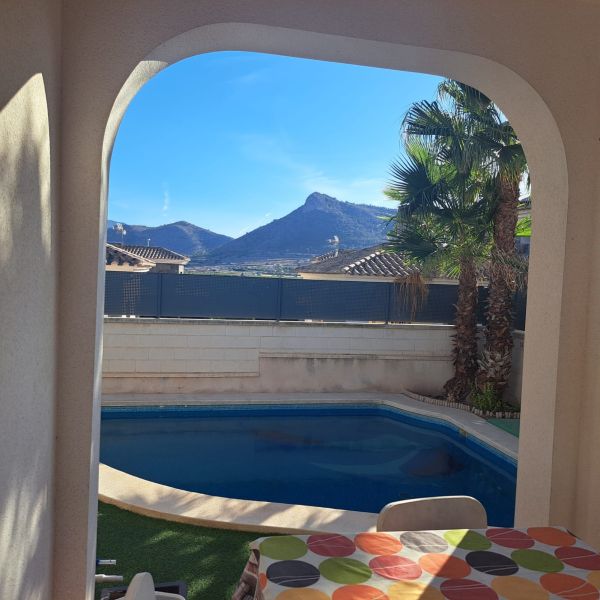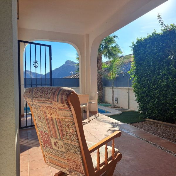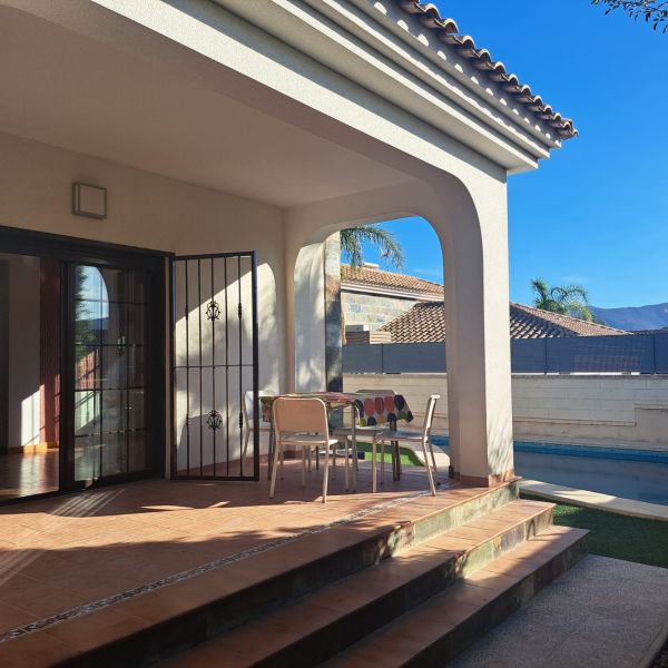 Ground floor villa in a small urbanization on the outskirts of Aspe (Alicante), just 35 minutes from the beach, with mountain views. The house consists of 3 bedrooms, 2 bathrooms (one en-suite), a large living room with chimney, a kitchen, a small utility room and a covered terrace. It has a living area of 117m² and a fenced plot of 380m². The garden features a private pool, a large terrace, a barbecue and parking for one car. The house was built in 2009 and has central air conditioning, electricity and mains water, as well as automatic garden irrigation. The house is located in a very quiet area with a children's park and soccer fields. It is just 5 minutes from the city center with all amenities, 15 minutes from Elche, and 30 minutes from Alicante Airport.Details: 3 bedrooms, 2 bathrooms, 117m² living space, 380m² fenced plot, garden, private pool, terrace, covered terrace, chimney, central air conditioning, barbecue, parking, built in 2009